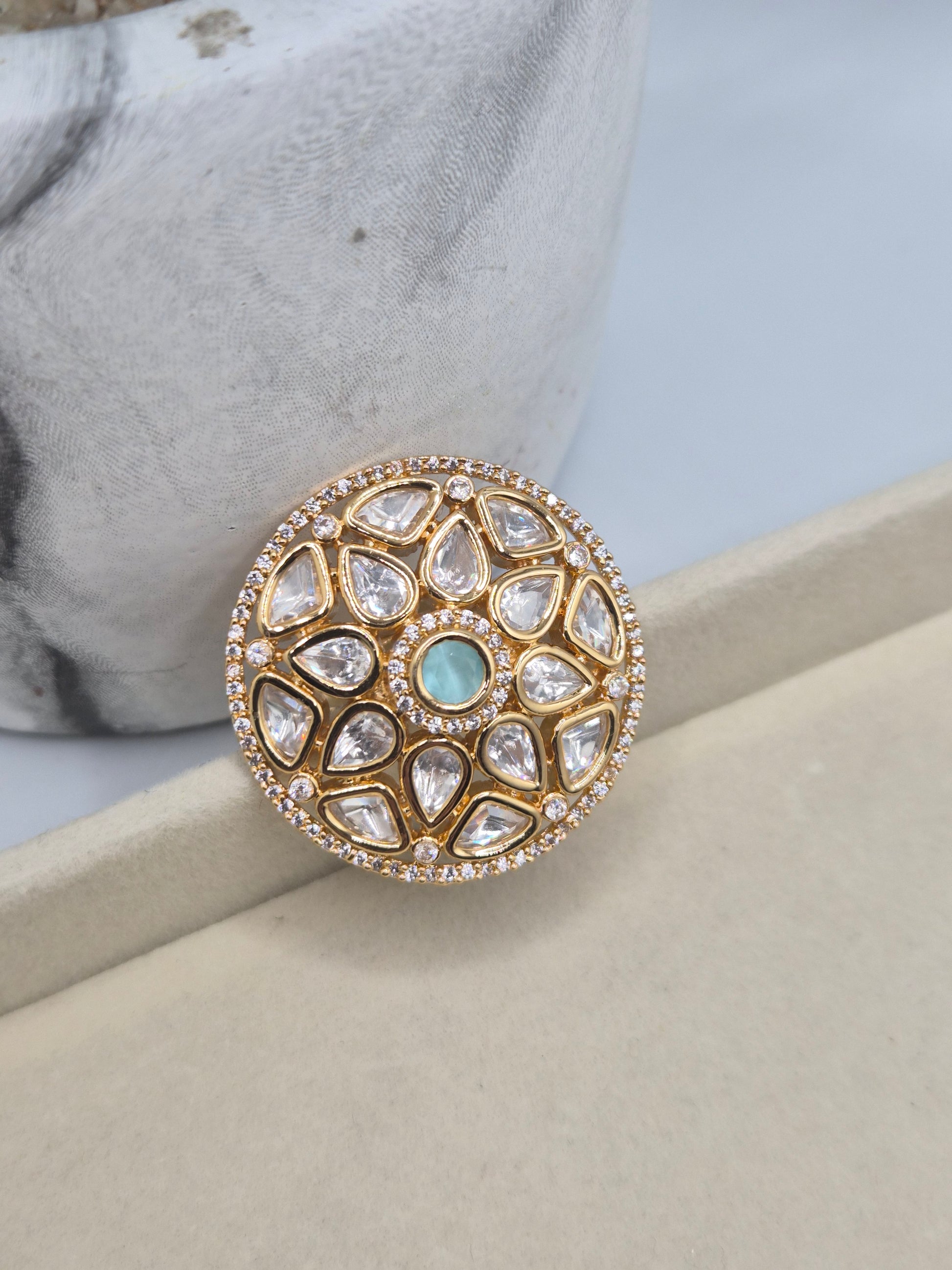 Adjustable kundan ring with mint green centre stone